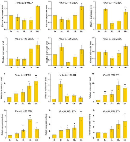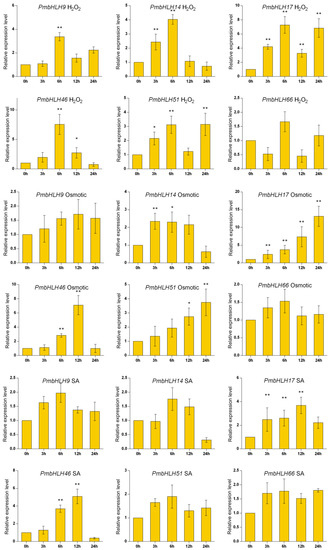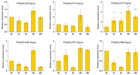 Expression of six PmbHLH genes under six treatments. Asterisks represent significant differences between each time point and 0 h (* p < 0.05, ** p < 0.01).