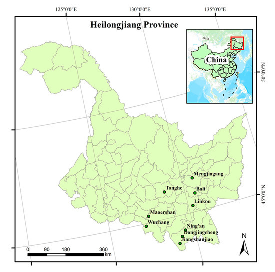 The distribution of the sampling plots in this study across Heilongjiang province, Northeast China.