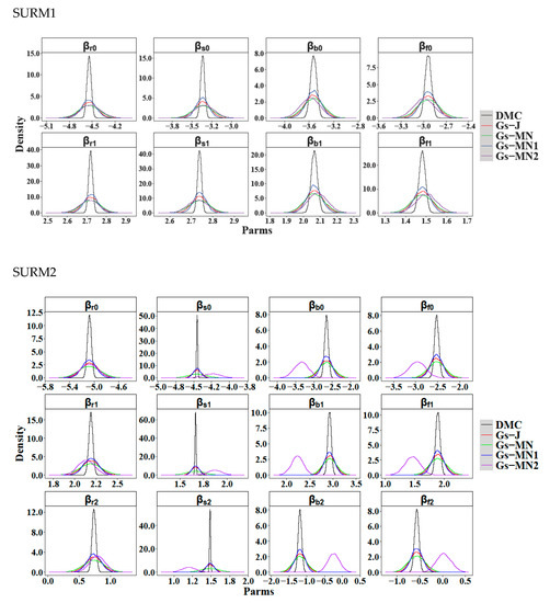 where and are the posterior- and prior-probabilities, respectively, is the likelihood, and the denominator of Equation (5) is the marginal probability of the data D [13]. Based on Equation (5), algorithms of Bayesian approaches were proposed on the SUR models [39]. To implement the Bayesian estimation, we fit the SUR models using both the Gibbs sampler and direct Monte Carlo (DMC) sampling along with different priors [39] (the detailed calculation processes of the Gibbs sampler and DMC are attached in Appendix A).