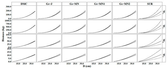 Considering the inherent correlations between tree components (additivity or compatibility) in developing biomass equations has been recognized as an essential characteristic of the biomass model systems [2,4]. Numerous SUR models in the literature commonly used one or even more constraints in the simultaneous model fitting process [18,52]. Zhao et al. [53], Dong et al. [14], and Widagdo et al. [54] conducted a comprehensive simulation and comparison of applying zero, one, and three restriction(s) in the SUR model systems. All of these researches confirmed that applying SUR without using any constraint, as proposed by Affleck and Diéguez-Aranda [55], gave slightly better model predictions than those using one or more constraints. Therefore, we decided to use no constraint to account for the correlations between tree components. Our results indicated that the correlation coefficients ranged from 0.1062 to 0.5836 across the tree components for SURM1, while they were slightly smaller (from 0.0026 to 0.5432) for SURM2. Therefore, it was appropriate to jointly fit the simultaneous biomass equations.