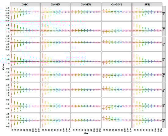 Simulation results for the parameters estimation of SURM1 using the DMC, Gs-MN, Gs-MN1, Gs-MN2, and FGLS. The dashed and solid horizontal lines represent the 95% confidence intervals and means of the simulation using the entire dataset (174 trees), respectively.
