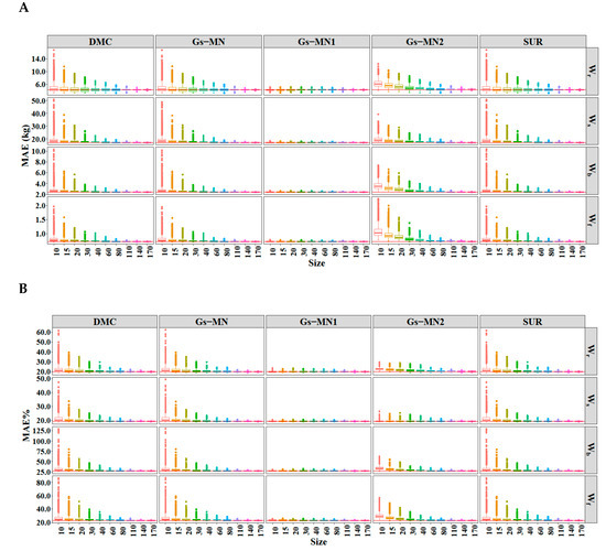 The MAEs and MAE%s were calculated using SURM1 produced in the simulations and reapplied to the entire data (Figure 5); the simulation result of SURM2 was highly similar to that of SURM1, as shown in Figure A2 (see Appendix B). The summary of MAEs and MAE%s for all methods and tree components across ten different sample sizes are given in Table A2 (see Appendix B). SURM2 had a higher prediction efficiency than SURM1 from the values of the MAEs and MAE%s. Further, the prediction bias of Gs-MN1 was most stable, indicating that a good informative prior has the advantages of using a small number of data. For Gs-MN2, the prediction bias calculated using the parameter estimates obtained from the small samples deviated significantly from those calculated using all data, although the ranges of MAE and MAE% were smaller than both Bayesian models with non-informative priors and FGLS.