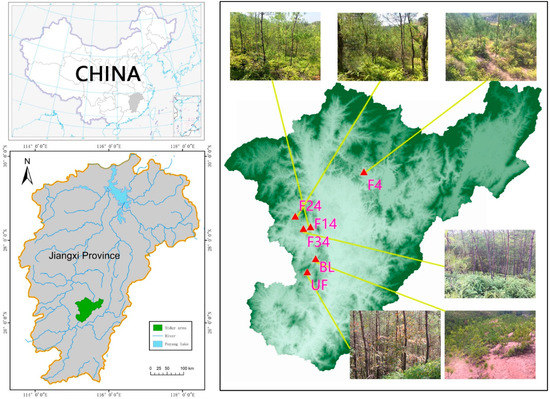 In this study, six forest sites with three replicates were chosen (Figure 1). Three plots (20 m × 20 m) were randomly set up at each stand site. First, the BL sites were used as a control, representing the original state before restoration. Due to the complete erosion of topsoil, coarse sands and mineral aggregates rich in Fe and Mn covered the bare surface. Second, we followed the control process of red soil eroded areas and selected four main stages of vegetation restoration, F4, F14, F24, and F34 (referring to 4 years, 14 years, 24 years, and 34 years since the completion of soil erosion mitigation efforts, respectively); the sites had the same parent rock and similar topographical conditions. Before soil erosion control, the entire Ah layer of the four forest sites had been lost due to soil erosion. From the end of soil erosion measures to now, all sites have been closed with no human disturbance. Finally, a nearby undisturbed forest (UF) represents the climax vegetation. The main characteristics of the vegetation and the surface soils (0–20 cm) among the six research sites are shown in Table 1 and Table 2.