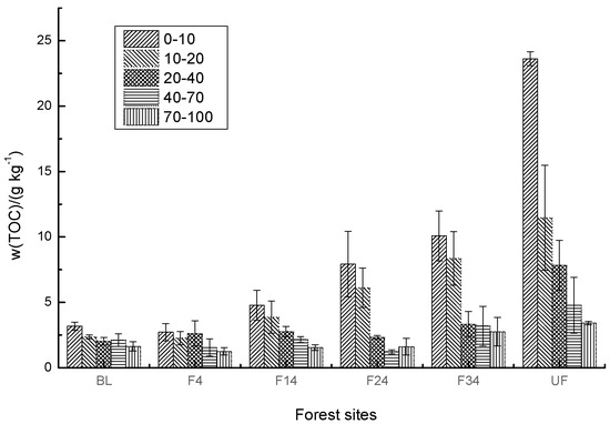 The vertical distribution of w(TOC) was obviously different in the different forest sites. In the BL and F4 plots, different soil layers had the same w(TOC) with variation coefficients of 25.55% and 31.35%, respectively (p > 0.05). In the F14, F24, F34 and UF sites, the w(TOC) in the 0–10 cm layer was significantly higher than that in the other soil layers (p < 0.05). In F24 and F34, the second soil layers (10–20 cm) had significantly higher w(TOC) than the other deep soils (p < 0.05). In the UF plots, there were significant differences among the five soil layers (p < 0.05). Consequently, the effect of vegetation restoration on TOC in deep soil was relatively small.