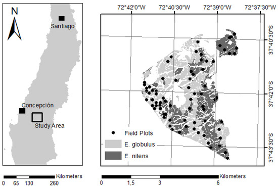 Data corresponds to a LiDAR inventory carried out in the commune of Angol, between the limits of the Biobío and La Araucanía region, Chile. 34 stands of E. globulus and 10 stands of E. nitens were evaluated in stand ages comprised in the range of 10 to 12 years. The total evaluated area was 1290 hectares, with stand areas between 1 and 248 hectares for E. globulus and between 0.5 and 414 hectares for E. nitens (Figure 1). The inventory was planned as an operational inventory by the company Forestal Mininco S.A.