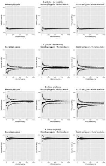 In this research, the convergence of the mean volume was achieved after 300 iterations and in the case of the variance after 500 iterations in the bootstrap approximations. Puliti, et al. [11] determined the variance estimator uncertainty according to the traditional bootstrapping-pairs method with 1000 iteration cycles, highlighting that they are sufficient to achieve the convergence of the mean and variance estimators. McRoberts, et al. [8] realized approximations of the estimate of the population variance with the traditional method of bootstrapping-pairs, not mentioning the number of bootstrap cycles, however, they emphasize that it must be performed until the convergence of the mean and variance is achieved. In the work of Martín-García, et al. [16] the estimator variance was determined with 10 thousand bootstrap cycles which we think is an excessive number considering the implementation at the operational level or used in stands of large areas. In the simulation carried out by McConville, et al. [24], 5000 bootstrap cycles were generated, showing that the variance stabilizes after 2000 cycles. In our work, various conditions of stands on different surfaces were evaluated, and in all cases 1000 cycles of the bootstrapping-pairs method were sufficient to achieve convergence of the mean and variance.