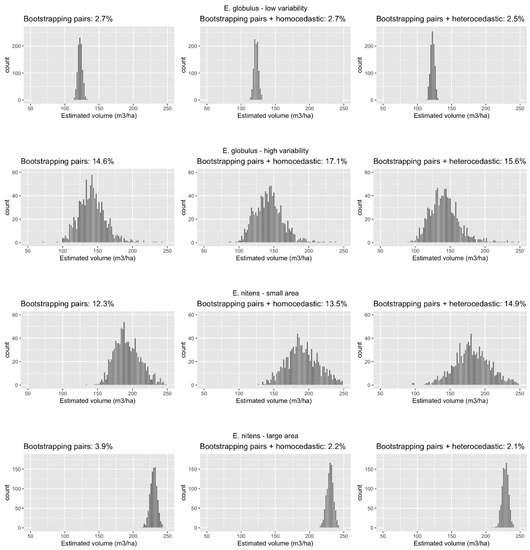 Example of distribution of the estimated mean volume generated by the bootstrapping-pairs. For E. globulus, a stand of 1 ha with low variability between pixels and a stand of 248 ha with high variability between pixels are showed. In E. nitens the smallest stand of 0.5 ha and the largest stand of 414 ha are shown as examples. Estimation uncertainty is detailed in percentage.
