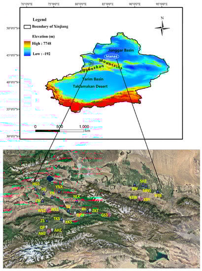 Instrumental climate records of 14 meteorological stations near sample sites were obtained from the China National Climatic Data Center (http://data.cma.cn), including monthly mean temperature, monthly minimum temperature, monthly maximum temperature, relative humidity, and total monthly precipitation (Figure 2, Table 2). The Manas River Basin is located in the middle of the North Tianshan Mountains and the southern margin of the Junggar Basin. Drought and less rain, large evaporation, and the same period of rain and heat, belonging to the typical continental climate, characterize the climate of the Manas River Basin. The annual mean temperature of the basin is ~4.7–5.7 °C, the annual precipitation is ~115–200 mm, and the annual evaporation is 1500–2100 mm. The Ili River Basin is located in the west of the North Tianshan Mountains; the annual precipitation in its plain area is different from in its mountainous area. The mean precipitation in plain area is 250–300 mm, which of the alpine plain area is 500–1000 mm. In particular, the max precipitation occurs at an altitude of 1000–2000 m in the mid-mountainous area. The annual average precipitation is 320.5 mm, while the annual average temperature is 6.3–9.6 °C. The monthly average precipitation appears to have “double peaks”. From January, the precipitation increases month by month and is most concentrated in May, June, and July, while the minimum precipitation appears in August and September and then shows a second peak in November. The monthly average temperature shows an obvious “single peak”, reaching a maximum in July and August. The rare precipitation and high temperature in August and September form the hot and dry climate, characteristic of summer.