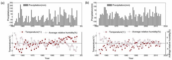 Long-term trend of mean annual climate data (temperature, precipitation, average relative humidity) of (a) Manas River Basin in the middle of the Northern Tianshan Mountain; (b) Ili River Basin in the west of the Northern Tianshan Mountain. Bars indicate annual precipitation anomaly (in mm), and curves with red color represent annual temperature anomaly (in °C), dashed lines with a hollow circle represent trends in annual average relative humidity anomaly (in %).