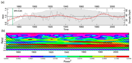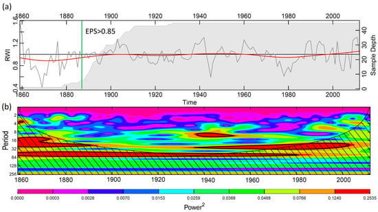 (a) Ili TRW chronology (standard (STD)) detrended using a 30-spline curve and the sample depths with respect to time (red line); the green line represents the expressed population signal (EPS) > 0.85. (b) The wavelet power spectrum. The contour levels were chosen so that 75%, 50%, 25% and 5% of the wavelet power is above each level, respectively. The black contour is the 1% significance level with a red noise (autoregressive lag1) background spectrum. RWI refers to ring width index.