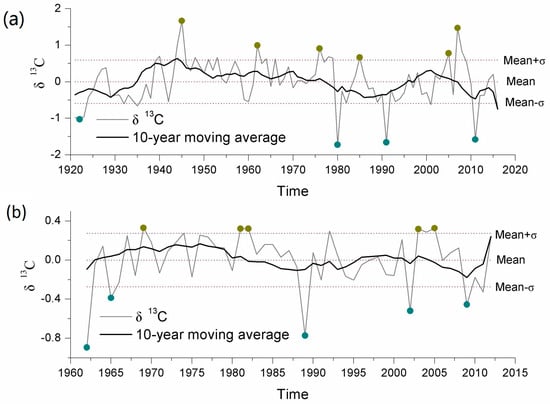 When a 10 year moving average was applied to the four series, the inter-decadal variability was conspicuous (Figure 5). The periods of enrichment of δ13C in Ili (above the mean value of the δ13C series) were 1939–1958 and 1961–1976. The periods of depletion of δ13C in Ili (below the mean value of the δ13C series) were 1929–1935, 1979–1983, 1988–1997, and 2010–2016 (Figure 3 and Figure 5a). The period of enrichment of δ13C in Manas (above the mean value of the δ13C series) was 1966–1978, and the periods of depletion of δ13C in Manas (below the mean value of the δ13C series) were 1986–1992 and 2007–2011 (Figure 4 and Figure 5b). The drought events of the Tianshan Mountains, which link with the Asian monsoon, are the most severe drought events, as evidenced by many dendroclimatological studies [,,,,]. The extreme drought years in the inner Tianshan Mountains were 1778, 1830, 1864, 1917, 1945, 1970, 1985 and 1995 when the TRW chronologies of Ili were lower than the mean – σ (standard deviation) and δ13C series of Ili was higher than the mean + σ (standard deviation). These dry events have had profound effects on the inhabitants of Western China and Central Asia over the past several centuries [,].