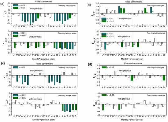 (a) Correlation coefficient of the lagged monthly temperature with the Ili TRW chronologies and isotope series. (b) Correlation coefficient of the lagged monthly precipitation with the Ili TRW chronologies and isotope series. (c) Correlation coefficient of the lagged monthly temperature with the Manas TRW chronologies and isotope series. (d) Correlation coefficient of the delayed monthly precipitation with the Manas TRW chronologies and isotope series.