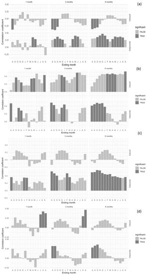 The previous results clearly show that the TRW chronology of Ili has a significant negative correlation with the July to September temperature, but the response of the TRW chronology is only seen in the September temperature as depicted in Figure 7a. The weather–growth analysis for the control plots showed no correlation with the previous seasonal temperature. However, there was a significant positive correlation between the δ13C series of Ili and mean autumn to early winter temperature (Figure 7b). We did not find significant correlations between TRW chronologies of Manas and temperature, but a significant positive correlation could be found from the previous August to the current July between TRW chronologies of Manas seasonalized precipitation (Figure 7c). The δ13C series of Manas showed a positive correlation with precipitation of summer. In addition to this, the seasonal correlation shows that the δ13C series has a significant positive correlation with the season at a six-month resolution, with the previous October being the ending month (Figure 7d).