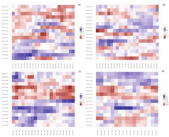 In the Ili River Basin, April–October is one of the most active periods of spruce growth throughout the year, and is the key period for tree-ring formation, at which time the cell division and elongation are more vigorous, completing more than half of the annual tree-ring growth []. The temperatures of April to October (both previous and current year) are important to the growth of trees in Ili (Figure 6a, Figure 7a,b and Figure 8a,b). Average monthly temperatures in Ili usually reach above 0 °C in late March of the year. Temperature rises rapidly from April and June, and the soil snowmelt recharge is basically consumed in late June. The average temperature reaches the highest value of the year in mid-August. Warm and dry late summers can reduce the accumulation of carbohydrate reserves by limiting photosynthesis through drought stress, by increasing respiration rate, and by diverting energy reserves to current year growth. Therefore, the consumption of plenty of water is necessary for such a rapid growth of spruce. On the contrary, this period is the water shortage period in Xinjiang, and the effect of low humidity and high temperature on tree growth is much greater than that of high humidity and low temperature. In addition, due to the vigorous growth of spruce in May–August, trees can store more nutrients to meet the needs of rooting and germination in the coming year. Therefore, the high temperature in May–August leads to a decrease in nutrient accumulation, which is not only unfavorable to the growth of tree-ring in that year, but also affects the growth of tree-ring in the next year. The negative correlation between the growth of tree-ring and the average temperature in June and July is significant in tree physiology.