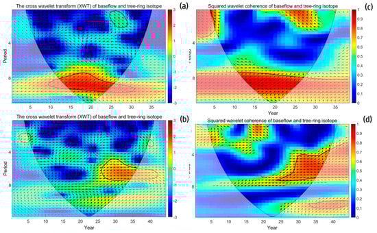 (a) Cross-wavelet transform of the Ili baseflow and tree-ring isotopes. (b) The wavelet coherence between the Ili baseflow and the tree-ring isotopes. (c) Cross-wavelet transform of the Manas baseflow and tree-ring isotopes. (d) The wavelet coherence between the Manas baseflow and tree-ring isotopes. The 5% significance level against the red noise is shown as a thick contour. The relative phase relationship is shown as arrows (with in-phase pointing right and antiphase pointing left). Arrows indicate the phase of the coherence, where the right is in-phase and the left is antiphase; note that significant regions all show an in-phase relationship, which supports the idea that there may be a simple cause and effect relationship between the two phenomena.
