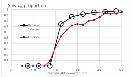 26]. It is found that the empirical sawlog yield function is smoother than the function taken from literature. Some sawlogs are gained from trees of diameter 175 mm, unlike in the literature data. On the other hand, the sawlog proportion of trees thicker than 200 mm is smaller in the empirical function. The latter probably is due to harvester operators being trained not to produce sawlogs that would be rejected at the mill.
