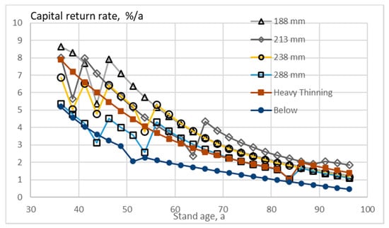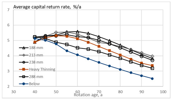 23], the capital return rate was not sensitive to rotation age. In the present results, it is sensitive to rotation age (