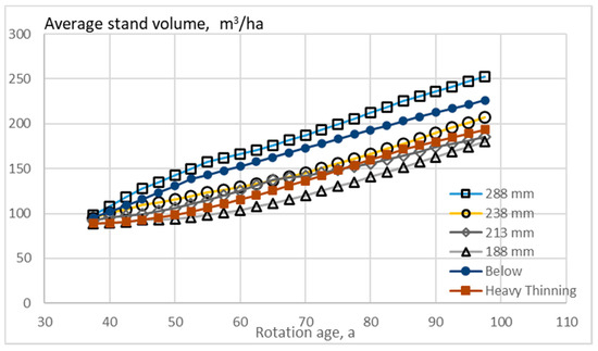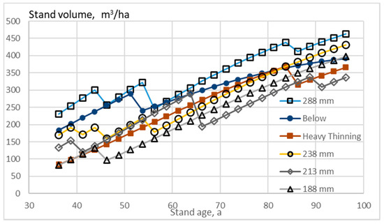 Figure 5). The greatest volume increment is gained by thinning above with the 288 mm cutting diameter limit, followed by thinnings from below. Initial heavy thinning leads to average stand volumes of the lower range.