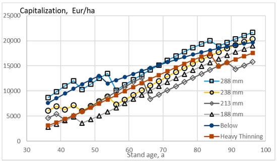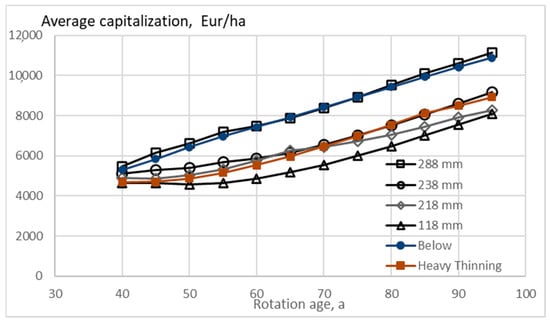 Figure 7). The average capitalization does consider the premium in clearcutting sawlog price, as well as the harvesting expense reduction, as it is computed as a function of rotation age. The average capitalization of thinning from above with the 288 mm limit almost unifies with thinning from below (