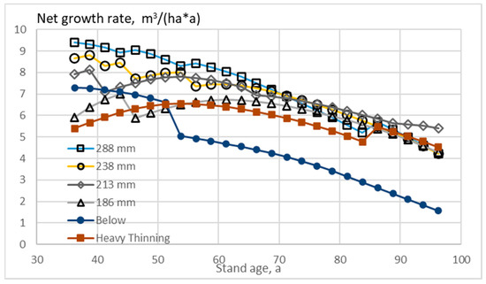 Figure 5). For the second half of rotation ages, the heavy thinning case almost unifies with the 238 mm thinning (