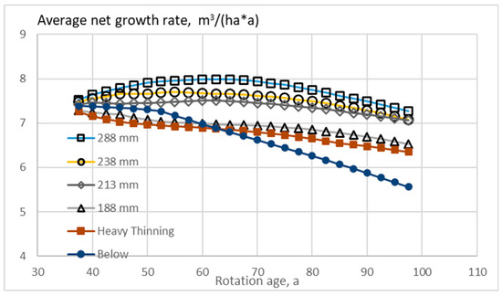 Figure 9. We, however, resist the temptation of applying such a 15-year margin. We suspect multiple thinnings from above after the optimal rotation age would result in loss of vigor of the remaining smaller trees, induced by their age and extended suppressed position.