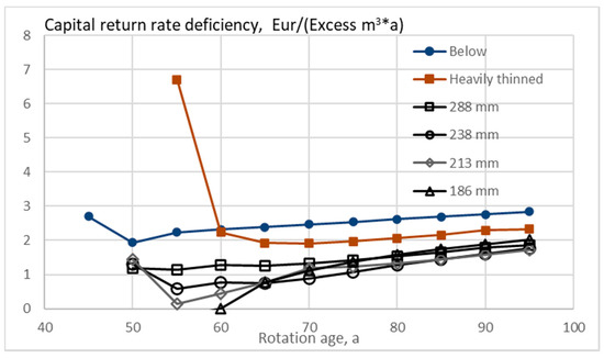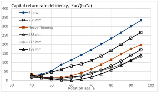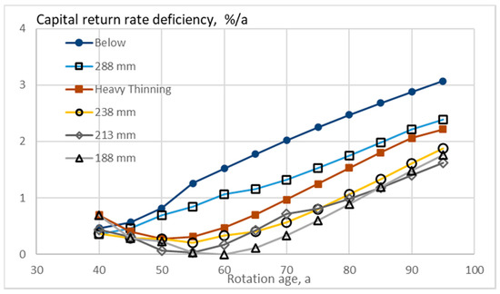 Figure 10. At the youngest rotation ages, the most severe thinnings show the greatest deficiencies. At greater rotation ages, thinning from below shows superior deficiencies, followed by thinning above with 288 mm cutting diameter limit, and the heavy thinning. Diameter limits of 238, 213, and 188 do not differ drastically, but in all cases increasing rotation age induces a significant capital return rate deficiency.