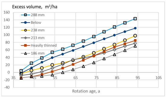 Figure 14). We find that the financially most effective way of increasing timber volume is to increase the cutting diameter limit. An excess volume up to 30 m