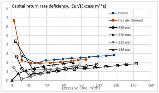 It is possible to allocate the capital return rate deficiency to the excess value of commercial stand volume. With prices applicable at the time of writing, the deficiency per excess volume is in the order of 1.5 Euros per excess standing cubic meter if the biomass density is doubled (