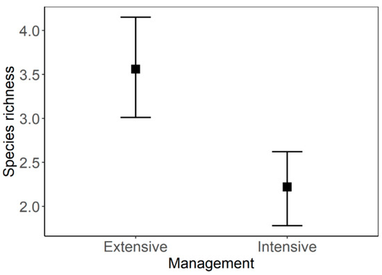 A total of 771 individuals belonging to 10 different species were collected (Table 1). Rodents were the most abundant group, comprising 76% of the total number of individuals collected, with the dominant species being Microtus arvalis. Insectivora were the other abundant group, which encompassed 24% of the total number of individuals collected, with the dominant species being Sorex minutus. Overall, three different families were presented: Soricidae, Muridae, and Cricetidae. The number of species significantly differed only between intensively and extensively managed clearings (glmmANOVA, LRT = 3.947, p = 0.0469). The plots with intensively prepared soil after clearcutting significantly decreased the number of species in comparison to extensively managed plots after clearcutting (Figure 1). Moreover, the small mammal species richness and abundance were not significantly different among the chronosequences of forest stands in different stages of succession or between intensively and extensively managed old-growth forests. The analysis of the species response curve also revealed that only one out of ten sampled species had significantly higher predicted abundance in the plots with intensively managed clearings. On the other hand, two species had significantly higher predicted abundance in intensively managed old-age forest stands (Table 1).