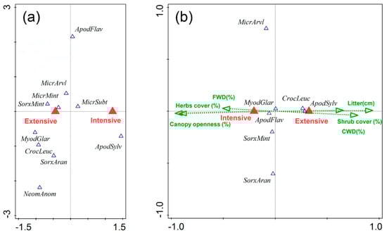 Partial canonical correspondence analysis biplot with the study month as a covariable showing (a) the change in small mammal assemblages at intensive (mechanical soil preparation after clearcutting) and extensive (without soil preparation) study plots; (b) differences within small mammal assemblages according to different management intensity (intensive—artificial thinning; extensive—natural regeneration) in old-growth forest stands. Forest characteristic were passively projected onto the ordination diagram. ApodFlav, Apodemus flavicollis; ApodSylv, Apodemus sylvaticus; MicrSubt, Microtus subterraneus; MicrArvl, Microtus arvalis; MicrMint, Micromys minutus; MyodGlar, Clethrionomys glareolus; CrocLeuc, Crocidura leucodon; NeomAnom, Neomys anomalus; SorxAran, Sorex araneus; SorxMint, Sorex minutus.