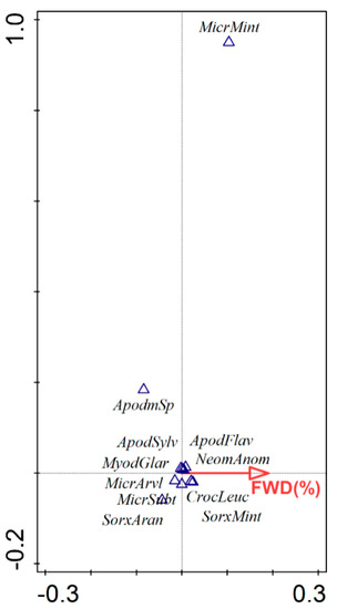 Partial canonical correspondence analysis biplot showing the effect of fine woody debris on small mammal species composition with the locality and successional age as a covariable. ApodFlav, Apodemus flavicollis; ApodSylv, Apodemus sylvaticus; MicrSubt, Microtus subterraneus; MicrArvl, Microtus arvalis; MicrMint, Micromys minutus; MyodGlar, Clethrionomys glareolus; CrocLeuc, Crocidura leucodon; NeomAnom, Neomys anomalus; SorxAran, Sorex araneus; SorxMint, Sorex minutus.
