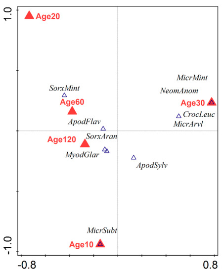 Moreover, we did not observe a significant decrease in species richness and abundance during the chronosequence of different aged forest stands [41,42,43]. This could be explained by the small number of species we sampled and by the great ability of small mammals to migrate between forest stands of different successional stages [37]. Small mammals are characterized by intensive breeding with high litter production, population fluctuation, and very active foraging patterns [44,45]. These characteristics allow rapid reproduction and spread to the surrounding landscape with roughly equivalent environmental conditions.