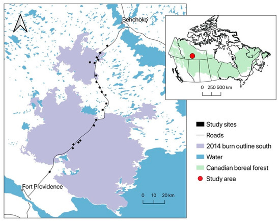 The study took place between Fort Providence and Behchok, in the Taiga Plains ecozone of the Northwest Territories, Canada (Figure 1). These communities are within the unceded territory of the Dehcho First Nation and the Tłı̨chǫ Mǫwhi Gogha Dè Nı̨ı̨tèè (boundary from the Tłı̨chǫ Agreement negotiated by the Dogrib Treaty 11 Council), respectively. The study area intersected two large burns (750,000 ha and 110,000 ha). These wildfires occurred in June and July 2014 during a record fire year, where 3,400,000 ha of the Northwest Territories burned [38]. This contrasts with an annual average area burned of 600,000 ha (1975–2014; [39]). The Taiga Plains ecozone is comprised of approximately 50% upland, 40% wetland (mainly peatland), and 10% open water [39]. From 1981–2010, the region surrounding the study area averaged between 289–387 mm of yearly precipitation (mean annual precipitation) and daily temperatures of −2.5 and −4.3 °C (mean annual temperature; [40]). With the exception of some shallow, inorganic mineral ponds, wetlands were primarily peatlands consisting of treed fens and bogs dominated by black spruce (Picea mariana (Mill.) B.S.P.; [16]) and dense shrub cover (e.g., Salix spp., Alnus spp.). All wetlands will hereafter be referred to as peatlands. Upland forests were dominated by jack pine (Pinus banksiana Lamb.) and some trembling aspen (Populus trembloides), with a generally closed canopy and sparse understory [16]. The Taiga Plains ecozone in the Northwest Territories is relatively unaltered by anthropogenic activities [16]. The study area had limited human disturbance with one highway, a few secondary roads, and limited non-commercial logging in some upland stands.