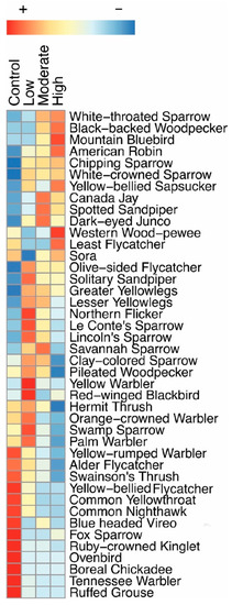 When we expanded our literature review to include burn severity in other North American forests, we found eight studies that quantified differences in fire severity on birds (Table 3). This included a meta-analysis from studies with high or low/moderate burn severities, but not necessarily all three severities in the same study [68]. The yellow-rumped warbler, ruby-crowned kinglet, and orange-crowned warbler consistently declined with fire severity across studies. The olive-sided flycatcher and western wood-peewee tended to increase. Many species had no significant effect of severity in some areas, but were consistent in their direction of change. For example, the American robin and white-throated sparrow tended to be higher in areas with more intense fire severity, while Swainson’s thrush tended to be lower. Results for Le Conte’s sparrow, palm warbler, ruffed grouse, and white-crowned sparrow were only available in our study. The Canada jay, chipping sparrow, common yellowthroat, dark-eyed junco, hermit thrush, Lincoln’s sparrow, and swamp sparrow showed inconsistent patterns of response to severity across studies. It is tantalizing to suggest that local adaptations to deal with a different fire regime in northwestern boreal ecosystems may explain the differences for these species. However, a more standardized approach to measuring fire severity and more consistent analytical framework are needed to truly test this hypothesis.
