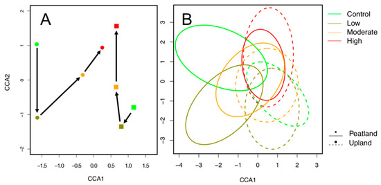 Partial canonical correspondence analysis (pCCA) ordination of bird communities in uplands and peatlands of increasing burn severity. Presented are (A) centroids of each treatment type (burn severity and vegetation types) joined by arrows indicating the direction of increasing burn severity for uplands (squares) and peatlands (circles); (B) 67% confidence ellipses around centroids (not shown) of each burn severity category.