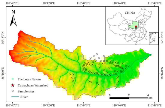 The study was performed at the small watershed of Caijiachuan (110°39′45″–110°47′45″ E, 36°14′27″–36°18′23″ N), which is a typical gully area of the Loess Plateau in Ji County, Shanxi Province, China (Figure 1). The area of the watershed is 40.1 km2, with an elevation range of 904–1592 m. The climate is a warm, temperate, continental monsoon, with a mean annual temperature of 10 ℃ and a mean annual rainfall of 579.5 mm. The annual evapotranspiration is approximately 3- to 4-fold the amount of precipitation [41]. According to the soil classification of the Food and Agriculture Organization (FAO) of the United Nations, the soil type in the region is mainly Haplic Luvisols, which are mostly alkaline [42].nThis soil type is locally known as cinnamon soil, and it is distributed on loess. The main tree species of artificial forests from the study area are R. pseudoacacia L. and Chinese pine (Pinus tabuliformis Carr.), while Manchu rose (Rosa xanthina Lindl.), Hawthornleaf raspberry (Rubus crataegifolius Bunge), and Periploca sepium (Periploca sepium Bunge) are the most dominant understory shrub species. The herbaceous cover consists of Eriophorum vaginatum (Carex rigescens), Artemisia selengensis (Artemisia sacrorum Ledeb.) and Radix rubiae (Rubia cordifolia L.), among others.