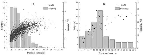 The height and diameter at breast height (D) distribution of all the investigated trees (A) and the destructively sampled trees (B). The vertical bar represents the distribution frequency across 2-cm diameter classes.
