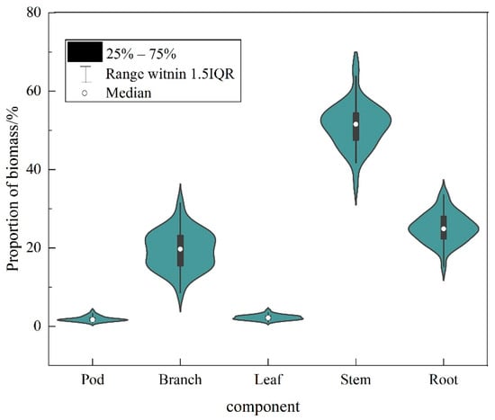 The diameter at breast height (D) varied between 6.2 and 23.2 cm, while the tree height varied between 4.7 and 14.7 cm (Table 1). The partitioning of tree total biomass into five components, namely pods, leaves, stems, branches, and roots, is shown in Figure 3. Among them, the stem biomass had the largest relative contribution to the total biomass, accounting for 51.82% of the dry wood, followed by the root biomass (24.63%); the pod biomass accounted for the smallest proportion (1.82%), followed by the leaf biomass (2.22%); the branch biomass had a share of 19.51% of the total biomass, and the above-ground biomass (i.e., the sum of the stem, branch, leaf, and pod) accounted for 75.37% of the total biomass (Figure 3).
