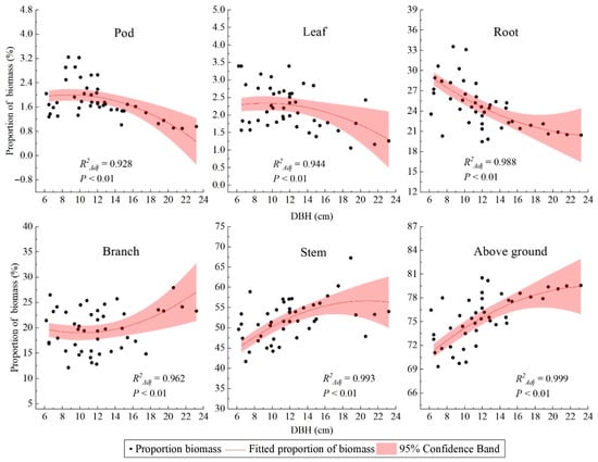 The nonlinear trend of proportion of each component’s biomass observations in total biomass as a function of D is presented in Figure 4. The red line represents the fitting relationship between the proportion of biomass of each constituent and D. The red area represents the 95% confidence interval. The results showed that the proportion of stem and above-ground biomass in the total biomass increased with the increase in D and tended to be stable. The proportion of branch biomass gradually increased with the increase in D, demonstrating a positive correlation. In contrast, the proportion of pods, leaf, and root biomass manifested an opposite trend in this study.