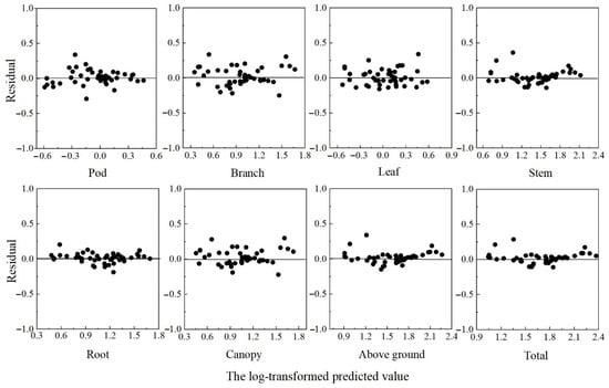 We based the model structure of the logarithmic function to construct the leaf, pod, branch, stem, root, crown, above-ground, and total biomass model. Moreover, seemingly unrelated regression (SUR) was used to simultaneously fit the total biomass and the biomass of each component to construct the additive systems of biomass equations so that the component model was not independent of the total amount to ensure the additivity of models. Three additive systems of biomass equations with cross-equation constraints on the structural parameters and cross-equation error correlation for biomass components, sub-total biomass (i.e., the above-ground biomass and crown biomass), and total biomass are as follows: