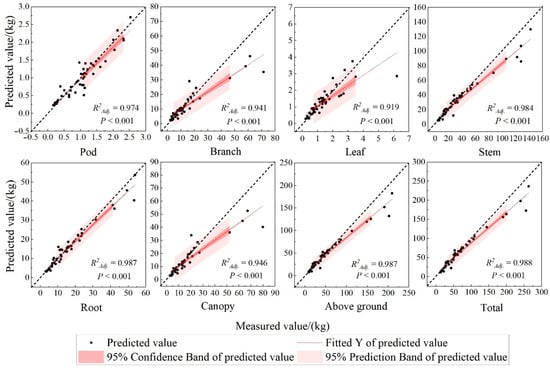 Scatter plot of the predicted and actual biomass values of each component with the best model, system 3. The solid red line refers to the fitting line between the measured values and predicted values. The dark red area is a 95% confidence interval, and the light red area is a 95% prediction interval. The dashed line in black color indicates the 1:1 equivalence.