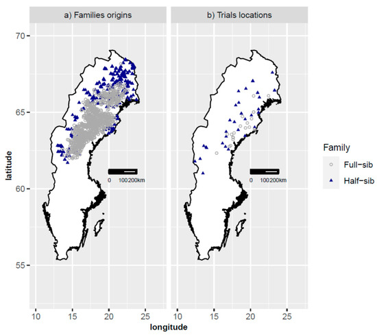 Family origins (a) and trials locations (b). Half-sib and full-sib materials are shown with triangles and circles, respectively.
