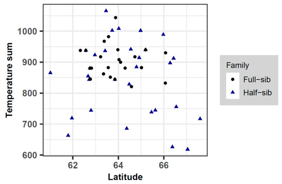 Summary of the temperature sum over the latitude of half-sib and full-sib field trials investigated in this study (mid-parents values represent these variables for full-sib families). Half-sib and full-sib families are shown with triangles and circles, respectively.