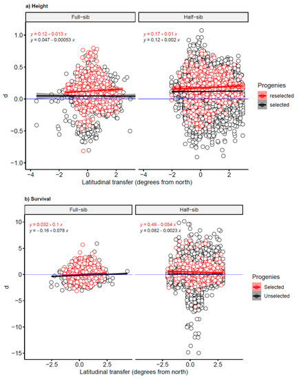The residual plots of height and survival showed no systematic patterns, implying the goodness of fit of the reference models. However, the estimated slopes for survival of full-sib families were significant and positive (Table 1). This suggests that when transferred to the south, the improved trees survive better than the model predicts, although this difference is of small practical significance. This finding is consistent with the result of another study which found an increase of the survival rate of full-sib progenies from first-generation Swedish orchard plus trees when planted south of their geographical origin [19]. Overall, all the models developed for transfer effects of Scots pine in Sweden indicate that survival increases with transfer to the south and decreases with transfer to the north [13,29]. However, although the estimated slope was nonsignificant, half-sib trees had a slightly better survival than the model predicted when transferred to the north. When comparing half-sib and full-sib progenies, in terms of their original climatic condition, half-sib families had generally been transferred to harsher sites (i.e., sites at higher latitudes with lower temperature sums) (Figure 1 and Figure 2). Therefore, high survival of trees under stressful conditions was an important criterion during the reselection of parent trees.