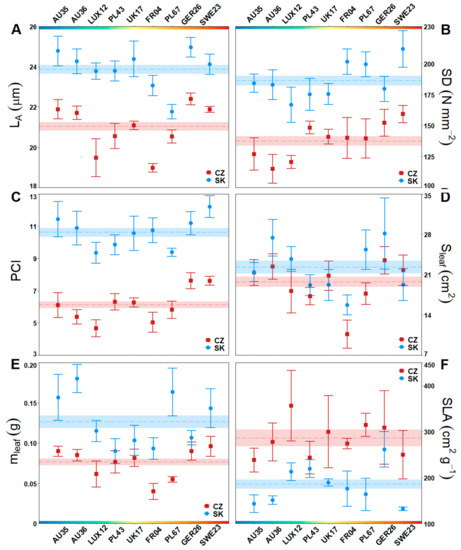 Mean values and standard errors of stomatal and leaf morphological traits per provenance: length of guard cell (LA, (A)), stomatal density (SD, (B)), potential conductance index (PCI, (C)), leaf size (Sleaf, (D)), leaf dry weight (mleaf, (E)) and specific leaf area (SLA, (F)). The red colour represents provenances growing in the Czech provenance plot, and the blue colour represents provenances growing in the Slovak provenance plot. The dashed horizontal line represents the average per plot with the surrounding standard error interval band. Provenances are arranged based on the Ellenberg quotient of the original site (blue to red x axis band).