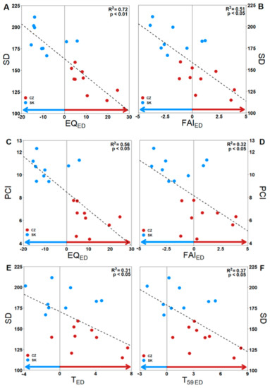 The multifactorial approach based on mixed models showed that the models with singular explanatory variables performed better than those with multiple factors; thus, a further analysis employed simple linear regression models (Table A2 and Table A3). The degree of aridity and temperature differences between provenances’ origins and new plots (ecodistance) had a significant effect on provenances’ stomatal development (Figure 3). The ecodistance of the Ellenberg quotient (EQED) and forest aridity index (FAIED) had a significant negative influence on SD (Figure 3A,B) and the PCI (Figure 3C,D). Provenances transferred to a drier environment relative to their original site showed a proportionally lower density of stomata with lower potential conductance. The ecodistance of average temperature (TED) and average temperature during the vegetation season (T59ED) also had a significant negative influence on SD, and provenances transferred to a climate warmer than that of their original site showed a proportional decrease in SD (Figure 3E,F). Other climate ecodistance indices showed no significant correlations with stomatal and leaf morphological traits.