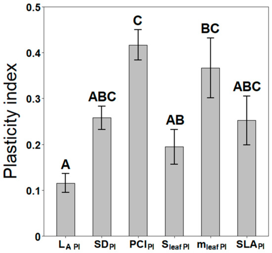 Phenotypic plasticity indices of stomatal density (SDPI), guard cell length (LA PI), the potential conductance index (PCIPI), leaf size (Sleaf PI), leaf dry weight (mleaf PI) and specific leaf area (SLAPI) for each provenance. Plasticity indices obtain values of 0 to 1, where 0 denotes no plasticity and 1 denotes theoretical maximal plasticity. Confidence intervals represent standard error and the capital letters correspond to results of post-hoc analysis.