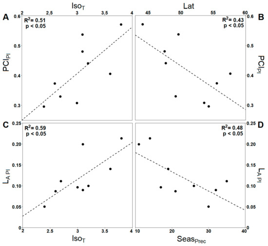 Linear regression results showing the relationship between isothermality (IsoT, (A,C)), latitude (Lat, (B)) and precipitation seasonality (SeasPrec, (D)) of the provenance’s original site and plasticity indices (LA PI, PCIPI).