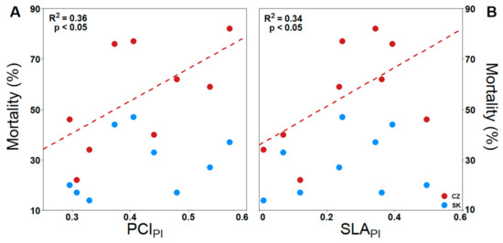 Visualization of the relationship between plasticity indices (PCIPI, (A); SLAPI, (B)) and the observed mortality of provenances in the Czech (red) and Slovak (blue) provenance plot. The linear regression was significant only for drier Czech provenance plot.