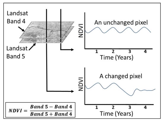 Conceptual diagram of the creation of Landsat time series (LTS) analysis inputs. For each pixel, brightness values for a user-specified combination of layers is measured for each scene in the record (for Landsat 8, a new image is acquired every 16 days). Normalized Difference Vegetation Index (NDVI), a commonly-used vegetation index, can be calculated for each scene from Landsat 8’s bands 4 and 5, and plotted against time. The properties of the resulting time series can be assessed to identify changes through time.